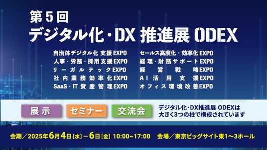 デジタル化・DX推進展 実行委員会(実行委員長:堀 正人/運営:株式会社イノベント)は、2025年6月4日(水)~6日(金)まで東京ビッグサイトにて「第5回 デジタル化・DX推進展(ODEX)東京会場」を開催いたします。今年は部門別の交流会、プレゼンテーションコンテスト、自治体向け出張研修などオフライン開催ならではの交流できる特別企画を多数実施いたします。課題解決へ導く製品・ソリューションが一堂に会し、100以上の特別講演・セミナーで効率的に情報収集、交流会・コンテストで他社の事例が共有・情報交換のできる場です。