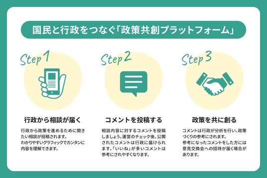 人々と行政がともに社会を創るための「政策共創プラットフォーム」です。オンラインで気軽に、行政にアイデアを届けることができます。国民や住民の行政に対する意見や要望を聴く活動(=広聴)をデジタル時代に対応した新たな仕組みへアップデートし、人々の幸せな暮らしに貢献します。