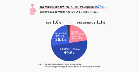 日本は自らの意見が社会に反映されていないと感じる国民が7割以上と高い水準になっています。この課題を解決するためには、誰でも気軽に行政との仕組みづくりに参加できるツールが必要です。サービス提供を通じて、住民と行政が共に政策を創る「政策共創」ができる社会を目指しています。