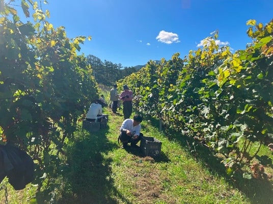 仁木町のワイナリーにおいて、ブドウの収穫を体験