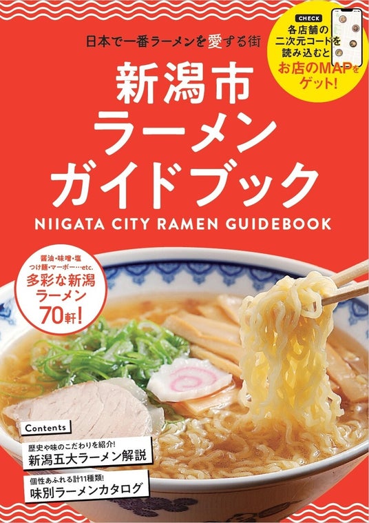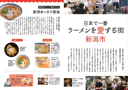 新潟ラーメンの魅力を伝えるため、新潟のラーメン文化や多様性を紹介したガイドブックを制作しました。市内8区にあるラーメン店を11種類の味に大別し、市民アンケートを参考に合計70店舗を選定・掲載しています。