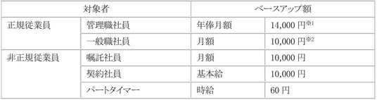 ※1 管理職社員のベースアップ額は一般職社員の賞与支給月数分(平均5ヶ月)を加味した額のため、年換算での管理職社員と一般職社員のベースアップ額は同水準。