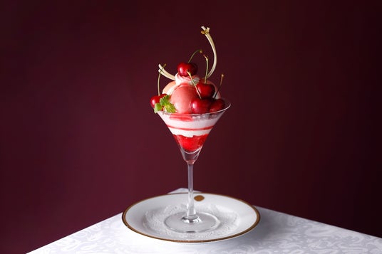 山形県産の希少なさくらんぼ“やまがた紅王”のパフェです。大玉で艶があり、酸味が少なく、糖度20度程度の実をシャーベットにまで贅沢に使用し、ジュレ、ソース、クリームで仕上げました。