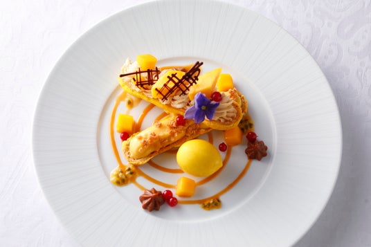◆宮崎マンゴーとキャラメルのエクレア仕立て バナナとマンゴーのソルベを添えて 2,700円
