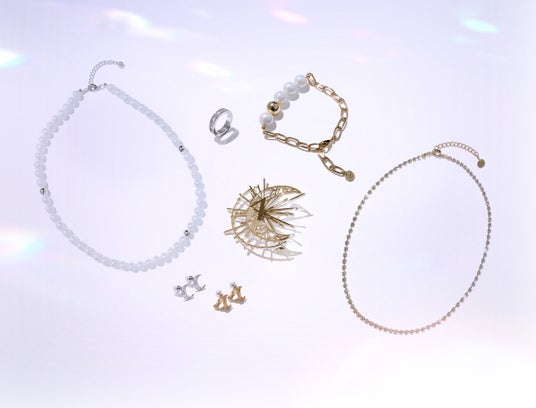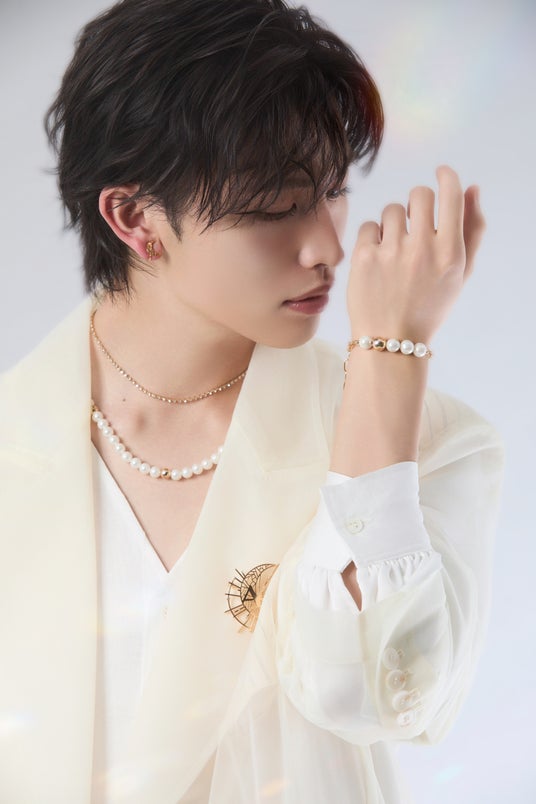 異なる輝きを重ねた2本のネックレスは、単体でも重ね付けでも楽しめます。ビジューとパール、強さと優しさ、月と太陽。そして、増子さんとファン。そんな“対”の存在をモチーフにしたデザインです。