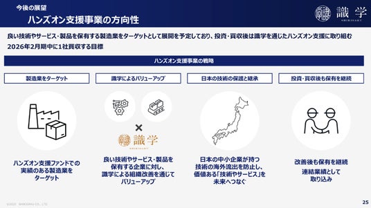 本事業の方向性については、下記の通り、2025年4月11日開示済みの決算説明資料のp.25で記載させていただいております。なお、既に実施しているハンズオン支援ファンド事業は対象会社の株式売却により収益を上げるビジネスとなりますが、本事業は株式を保有し続け、その業績を連結取り込みしていく点が大きな違いとしてあげられます。