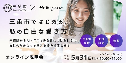 Ms.Engineer株式会社(本社:東京都千代田区、代表取締役:やまざき ひとみ)は、経済産業省および厚生労働省の認可を受ける女性IT人材育成スタートアップとして、新潟県三条市にて地域女性向けのITスキル育成を2025年度より開始します。本取り組みは、三条市在住の女性に柔軟な働き方を提案するもので、三条市「高度ITスキル習得支援補助金」(※)を活用し、希望者が無理なく参加できる支援体制を整えています。