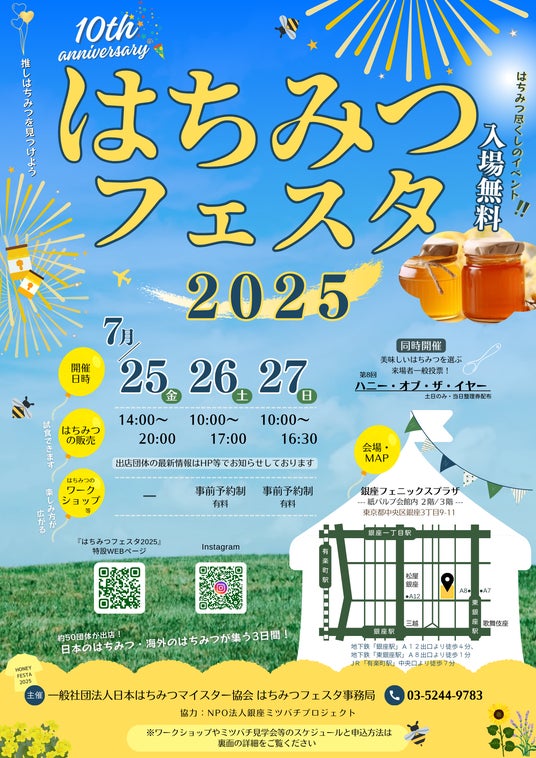 はちみつの資格を運営する一般社団法人日本はちみつマイスター協会(東京都中央区、代表理事:河村千影)は、はちみつの日(8/3)の直前の週末にはちみつの様々な使い方が学べて、各地のはちみつが購入できるイベント「はちみつフェスタ2025」を銀座にて開催いたします。はちみつ尽くしの3日間を是非お楽しみください!