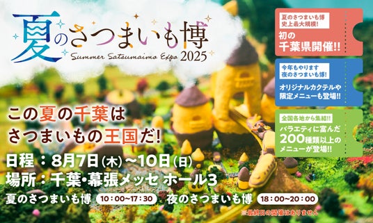 さつまいも博実行委員会(代表:石原健司、東京都新宿区西新宿7-7-26)では、8月7日(木)から10日(日)までの四日間、千葉県・幕張メッセ(千葉県千葉市美浜区中瀬2丁目1)におきまして開催する『夏のさつまいも博2025』の出店店舗が決まりました。併せて、「夜のさつまいも博」での有料テーブル席が先行で入手できるクラウドファンディングも開始いたしましたので、お知らせいたします。