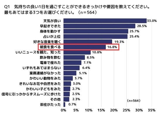 気持ちの良い一日を過ごすことができるきっかけをうかがったところ、「天気が良い」(33.0%)、「早起きできた」(28.5%)、「占いが上位」(25.4%)など、ほっこりする回答が上位に。