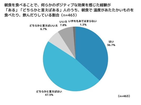 朝食を食べることで82.1%がポジティブな効果を実感。そのうち84.2%が朝食に「あたたかいもの」を取り入れている