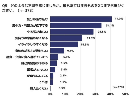 具体的には、「気分が落ち込む」(41.0%)、▽「集中力・判断力が低下する」(34.1%)、▽「やる気が出ない」(28.8%)、▽「気持ちの余裕がなくなる」(21.2%)などが上位となっています。