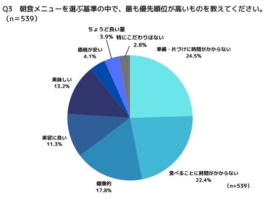 朝食メニューを選ぶ基準で最も優先順位が高いものは、時短にまつわる回答が46.9%。他にも「健康的」「美味しい」「美容に良い」など、全体的に回答が割れる結果に