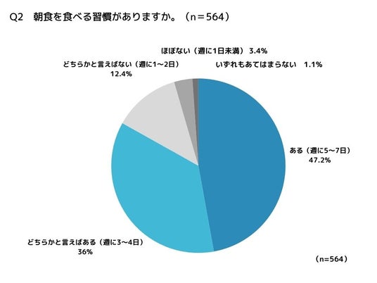 朝食を食べる習慣が「ある(週に5~7日)」は47.2%。「どちらかと言えばある(週に3~4日)」は36.0%となり、働く人々の朝食喫食率は高い水準であることが明らかになりました。