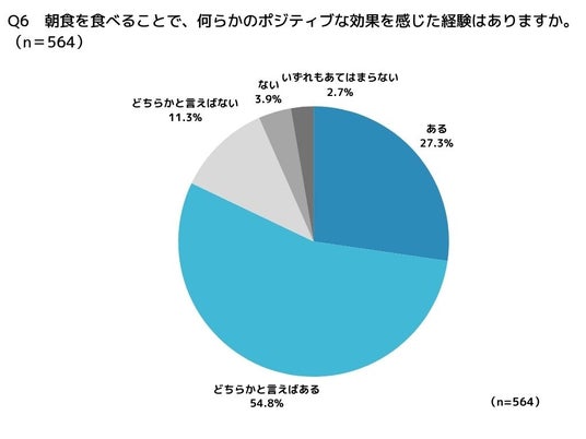 朝食の欠食による不調とは反対に、朝食を食べることでポジティブな効果を感じた経験が「ある」という方は27.3%、「どちらかと言えばある」方は半数超えの54.8%で、合わせると82.1%(463人)にのぼりました。