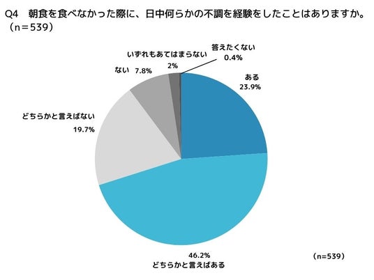 朝食を食べなかった際に、日中に何らかの不調を感じた経験が「ある」方が23.9%、「どちらかと言えばある」は46.2%と、合わせると70.1%で3人に2人は不調を経験していることが明らかになりました。