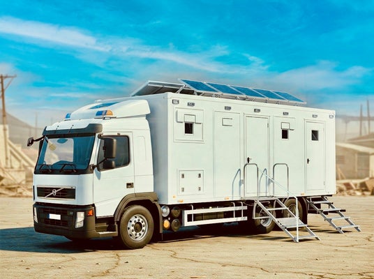 【「循環型トイレトラック」概要】災害時に移動が可能なトラック(4t仕様)。内部には、洋式トイレが4つ設置されています。(全てオストメイト対応トイレ)