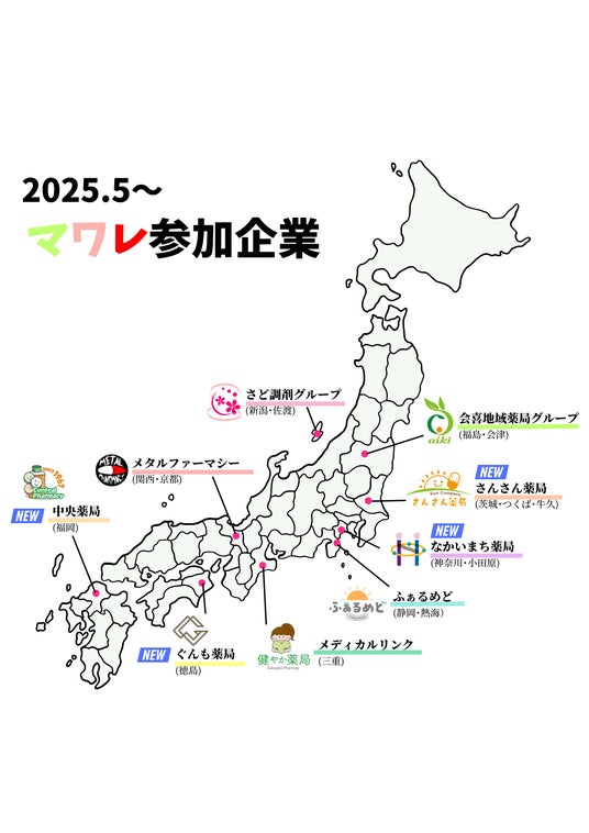 その後2社(メディカルリンク、ふぁるめど)を加え、5社での運営を行ってきましたが、このたび新たに4社(ぐんも薬局、さんさん薬局、中央薬局、なかいまち薬局)が加わり、参画企業が計9社に拡大したことをお知らせいたします。