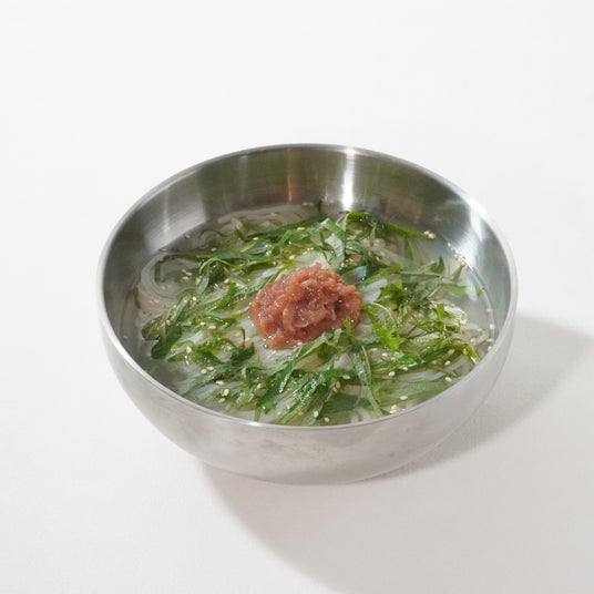 りんご苑梅しそ 冷麺:梅のほどよい酸味と、香り豊かな青じそを組み合わせた、爽やかさ抜群の冷麺。後味すっきりの和風テイストで食欲が落ちがちな暑い日にもぴったりで、女性人気も高い、上品な味わいの一杯です。