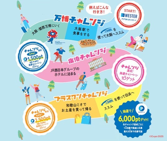 さらに、所定条件の達成に応じて、WESTERポイント(基本)6,000ポイントが当たる抽選応募口数が最大3口まで獲得できるチャンスもご用意しています。この機会にぜひ、鉄道をつかって大阪・関西万博が開催されている大阪をはじめ、西日本各地のご旅行をお楽しみください!
