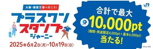 西日本旅客鉄道株式会社(大阪府大阪市北区、代表取締役社長 長谷川 一明)、株式会社ジェイアール西日本デイリーサービスネット(兵庫県尼崎市、代表取締役社長 中西 豊)、JR西日本SC開発株式会社(大阪府大阪市北区、代表取締役社長 橋本 修男)、株式会社ジェイアール西日本ホテル開発(京都府京都市下京区、代表取締役社長 伊勢 正文)は、 2025年6月2日(月)~2025年10月19日(日)において、WESTERポイント(基本/期間・用途限定)が合計最大10,000ポイント(※)当たる「プラスワンスタンプジャーニー」を実施します。