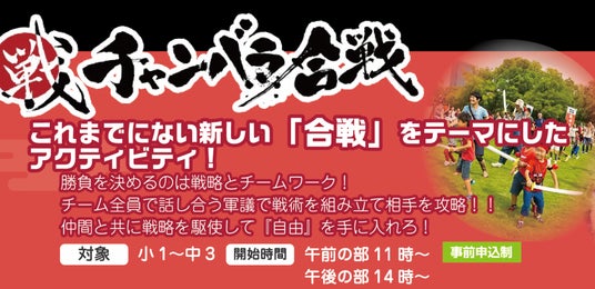 チャンバラ合戦は柔らかいスポンジ刀で敵の腕についているボールを狙い落とすゲームです。今回は15対15の軍に分かれて全滅戦や大将戦のルールで行います。参加無料、小学1年生~中学3年生までが対象です。