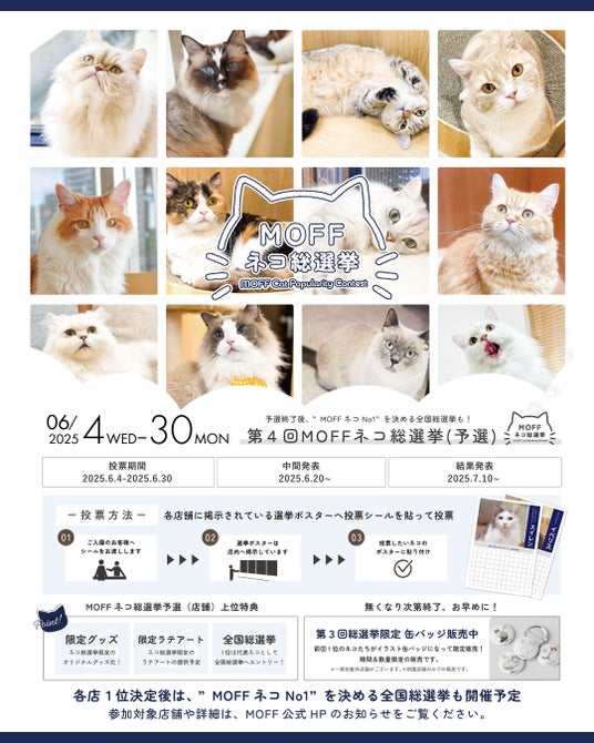 「動物と人間が笑顔で幸せに暮らせる社会の実現」を目指し、全国に屋内外型動物園、水族館、アニマルカフェ、ネコカフェを展開する株式会社MOFF(本社:茨城県石岡市、代表取締役:矢口 宗平、以下 MOFF)は、運営施設(Moff animal world、Moff animal cafe、Cat Cafe MOFF、コックンの別荘、カワスイ 川崎水族館内ソラネコカフェ)に在籍する約760頭にも及ぶネコたちによる「MOFFネコ総選挙」が今年も開催されます!