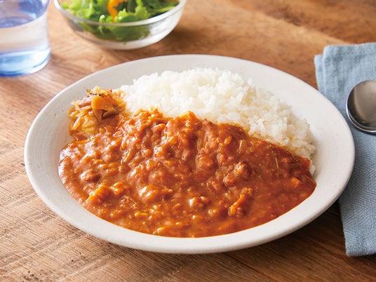 トマトと国産野菜(玉ねぎ、人参、かぼちゃ、れんこん、セロリ)、国産鶏ひき肉入りのカレーです。パルシステム茨城 栃木の利用者が開発に協力した商品です。