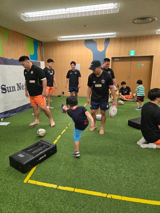 事前予約の3部制で開催した今回のイベントには、376名のファミリーが来場。地元で子育て支援をしている出展者が、ヨガやベビーマッサージ、手形アート、睡眠講座など、親子で一緒に体験できるブースを提供しました。中には事前予約の開始直後に満席となるほどの人気ブースもあり、来場したファミリーは親子で様々なブースに笑顔で参加。午後には地元ラグビーチーム「日立Sun Nexus 茨城」の選手が登場し、子どもたちが選手とキャッチボールやタックルを体験する様子も見られました。