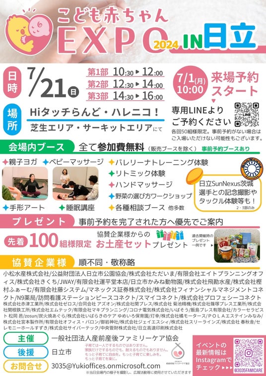 2024年7月21日(日)茨城県日立市Hiタッチらんど・ハレニコ!にて、子育てファミリーに楽しみ、正しい情報、繋がりを提供する「こども赤ちゃんEXPO 2024 in日立」を開催し376名が来場。