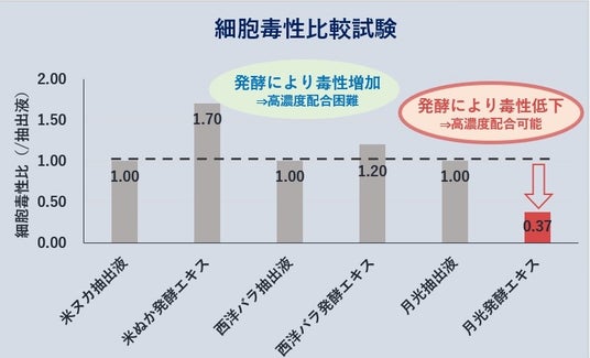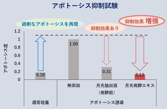 月光と乳酸菌のHOKKAIDO株(R)を掛け合わせて確認したところ、7つの効果のうち、ニトロ化物分解、アポトーシス抑制、低細胞毒性の3つにおいて、その効果が発酵により著しく増強することがわかりました。また糖化物分解効果、糖化抑制効果、カルボニル化抑制効果、ニトロ化抑制効果についても発酵させることでその効果が減少することはなく、同等以上の効果を持つこともわかりました。これらの結果から、複数のアンチエイジング効果を持ち高濃度配合が可能な成分の開発が実現しました。
