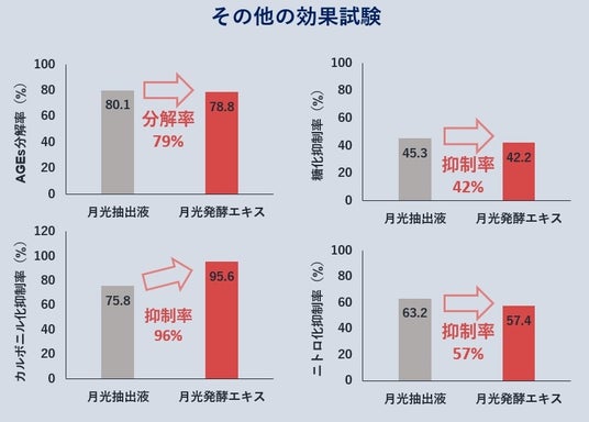 宮城県登米市の自社バラ園で栽培を行い3年かけた研究の結果、「月光」には単独でも角層部分でニトロ基と角層タンパク質が結合して起こる肌の黄ばみの一因となる現象であるニトロ化を抑制する効果、ニトロ化物を分解する効果、紫外線などで過剰に誘導されることで肌の異常な角化や肌荒れの原因となるアポトーシス(細胞死)を抑制する効果、細胞毒性を低減させる効果、糖化物を分解し、糖化を抑制する効果、角層細胞の接着因子の分解を抑制し正常な角層剥離が行われなくなるカルボニル化を抑制する効果があることがわかりました。