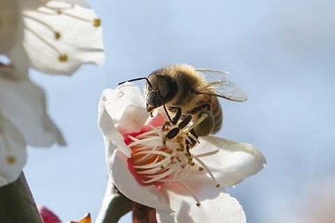 梅の多くの品種は自家受粉できないため、異なる品種の梅の木を近くに植え、ミツバチによる受粉を行い、実をつけます。花が少ない早春はミツバチにとっても貴重な蜜源となり、双方にとって有益な関係が築かれています。