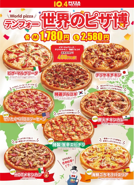 北海道生まれの宅配ピザチェーン10.4( テンフォー) を運営する、株式会社テンフォー( 本社・北海道函館市/代表・高橋仁志)は、世界各国の名物料理をピザにアレンジした5種類の新商品と人気の定番ピザ3種類をお得な価格で提供する『世界のピザ博』を2025年5月31日(土)より開催いたします。