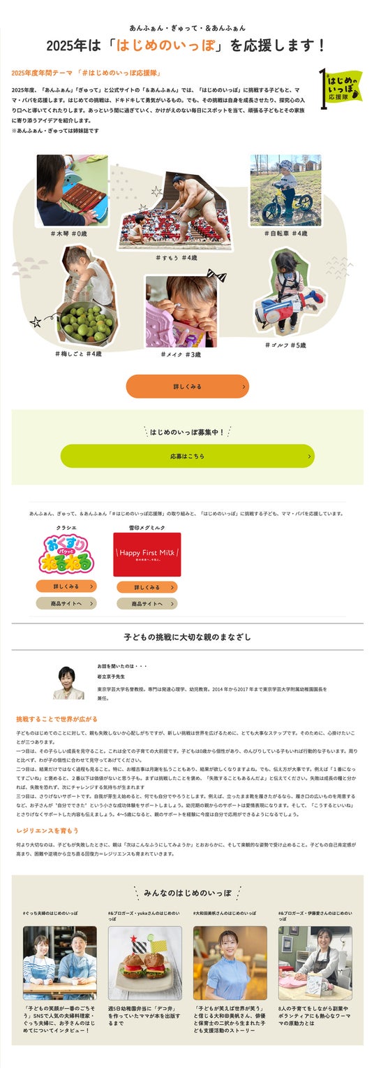 あんふぁん・ぎゅって公式サイト「&あんふぁん」では、「#はじめのいっぽ応援隊」の特設ページを公開しています。読者から寄せられた「はじめてエピソード」を毎月公開します。