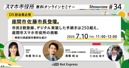 株式会社Bot Express(本社:東京都港区、代表取締役:中嶋 一樹、以下 Bot Express)は、官公庁・地方自治体のDX事例を共有する無料オンラインセミナー「Bot Express Showcase」を毎月開催しています。7月10日(木)の開催が決定しましたのでお知らせいたします。