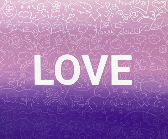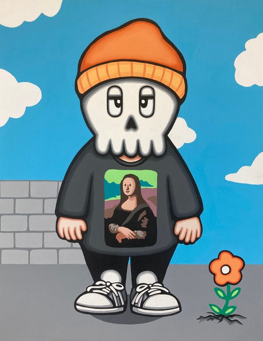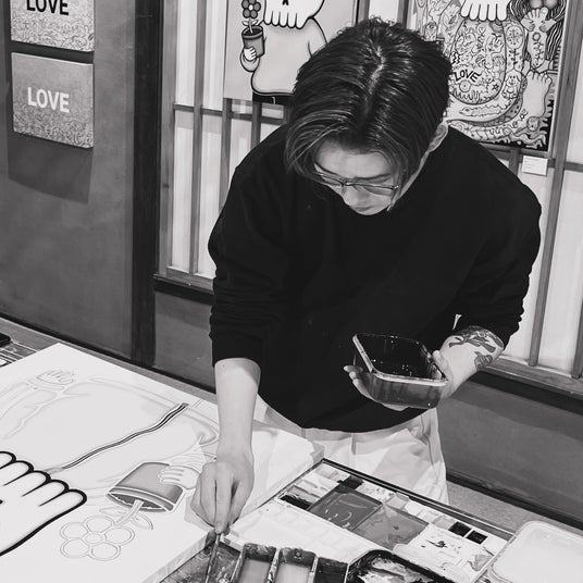 LOVE、 HELLOの文字が書かれた作品は、鑑賞者との心の繋がりを意識して生まれたシリーズです。作品の背景には様々な感情を持つ生き物たちの、愛情や楽しさを表す無邪気な様子を描いています。スカルは私が子供の頃から好きなモチーフでもあり、 大人になるにつれて死のイメージが強く感じる様に変化していった存在でもあります。生死感と向き合う制作を続けていく中で、 死を考える事は生きる事を必死に考えているんだと気づきました。そこから誕生したのがドクロくんです。そして2022年、私が小学生の頃から飼っていた猫が亡くなりました。懸命に生き抜いた猫の命のバトンは、沢山の願いや祈り、あたたかな思いとともに今を生きる命へと繋いでいくという考えがある事を知りました。そんな中、地元宮城県で保護された猫がゴロ太郎でした。 実家で暮らす様になり新たな命のバトンを受け取りました。 人間も動物もみんなが幸せを感じながら、 共に生きられることを願って作品に登場してもらっています。ポジティブな思いを込めた作品を、 現在、未来の人に届けたい。