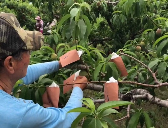 援農は、モモの実を大きくするための摘果作業を終えた農地で実施します。農薬使用量の削減に努めているため、病害虫などの被害や傷みを防ぐ目的でモモの実に袋をかけます。農地の全てのモモの実を守るため、生産者は毎日、何千枚もの袋掛けをしています。参加者家族が作業を手伝うことで、農薬削減の生産の努力を体感し、食味よく安心して食べられる果実への感謝を伝えます。