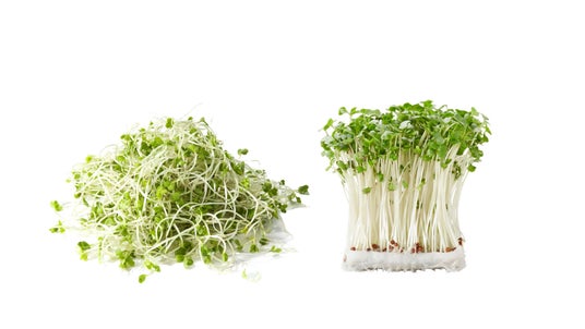 左:もやしタイプ(発芽後約3日)のブロッコリースプラウト、右:かいわれタイプ(発芽後約1週間)のブロッコリースプラウト