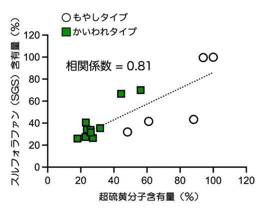 上のグラフのとおり、ブロッコリースプラウト内のスルフォラファン含有量と超硫黄分子含有量の相関係数は0.81です。相関係数は−1~+1の値で表され、0.8以上では「非常に強い正の相関がある」と言えます。つまり、スルフォラファンの多いブロッコリースプラウトほど超硫黄分子も多く含有しているという強い傾向があることが明らかになりました。