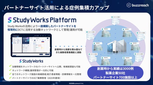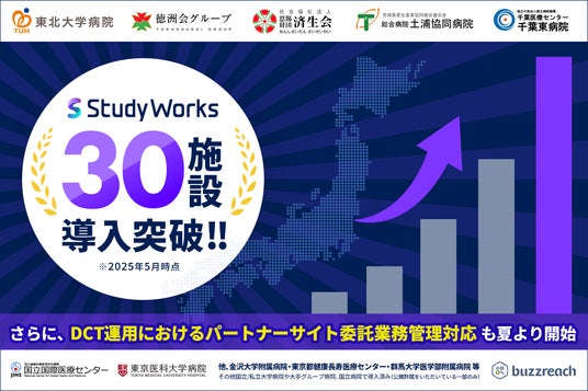 株式会社Buzzreach(本社:東京都港区、代表取締役:猪川崇輝)は、治験業務支援SaaS「StudyWorks(スタディワークス)」が、2025年5月時点で全国30ほどの特定機能病院や中核病院など多数の治験を実施する医療機関に導入がされたことをお知らせいたします。また、このたびDCT(分散型臨床試験※)に対応した「パートナーサイト※を含めたDCT業務管理機能」の一部提供も夏頃より開始することも合わせてお知らせ致します。