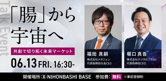 小型ライフサイエンス実験装置の開発や宇宙産業の活性化・新事業創出をサポートする株式会社DigitalBlast(東京都千代田区、代表取締役CEO:堀口真吾、以下デジタルブラスト)は、株式会社メタジェンとの共催にて、2025年6月13日(金)にトークイベント『「腸」から宇宙へ 共創で切り拓く未来マーケット』を開催することをお知らせいたします。
