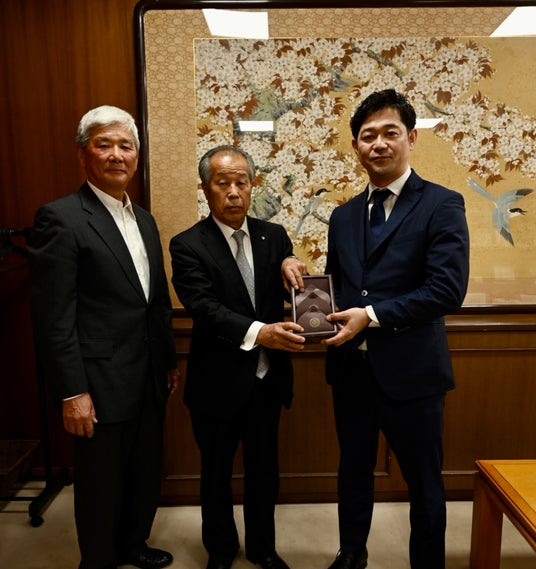 左 下飯沼栗生産販売組合組合長 田口一彦さん、 中央 茨城町長 小林宣夫さん、 右 弊社代表 藤田