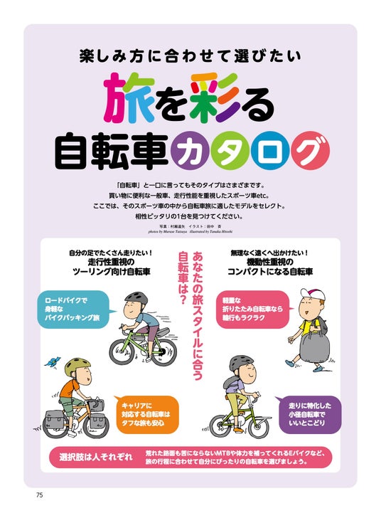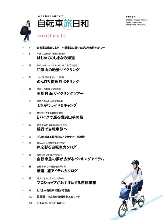 本誌では、愛車と自転車旅に出かけるためのノウハウや、おすすめのサイクリングルート、旅で活躍する自転車やアイテムなどを幅広く紹介。