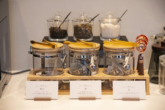 ハーブティーは「花」「森」「土」の3種のブレンドからお選びいただけるノンカフェインで香り高い一杯。
