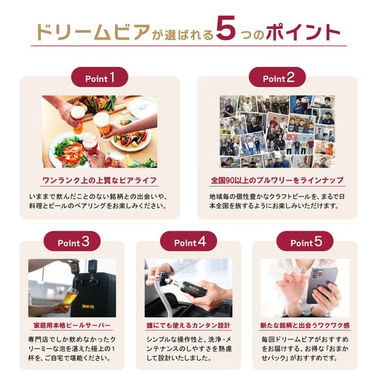 ドリームビアは個性豊かなクラフトビールを、自宅に居ながらまるで旅するように楽しめる会員制サービスです。プロ仕様の家庭用本格ビールサーバーで、全国のブルワリーとご家庭をつなぎ、バラエティに富んだ味わいと新しいビール体験をお届けします。