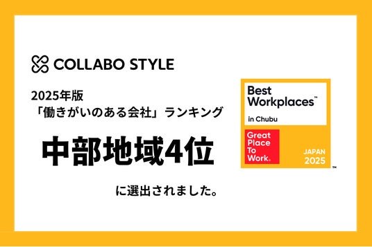 株式会社コラボスタイルは、2025年5月29日(木)にGreat Place to Work(R)︎ Institute Japan(以下 GPTW Japan)が発表した『2025年版各地域における「働きがいのある会社」優秀企業』において、中部地域4位に選出されました。コラボスタイルの中部地域における優秀企業選出は、3年連続3回目です。