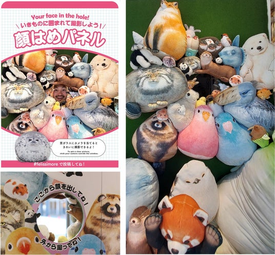 正面入り口で目を引くのが、窓ぎわいっぱいに積み重なる動物たち。店内に入ってパネルの丸抜きから顔をのぞかせると、もふもふの動物に包まれるという妄想が叶う写真を撮ることができます。
