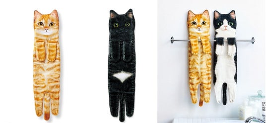 抱き上げると予想外に胴が伸びる猫の特徴を再現したタオルです。タオルバーにぶら下がる姿は、まるでいたずら中の猫ちゃんのよう。両手のスナップボタンでずれ落ちストップ。おなかをなでる気分で手をふけば、綿100%の肌ざわりに癒やされる!背中もしっぽも肉球も、リアルな柄でタオルなのに抱きしめたくなるかわいさです。特にアジア圏のお客さまからの人気が強く、一度に複数購入していく姿も多く見られます。