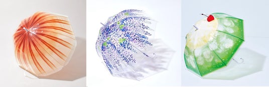 左からデザイン傘部門の第3位「アカクラゲの傘」、第4位「藤棚の傘」、第5位「メロンクリームソーダの傘」